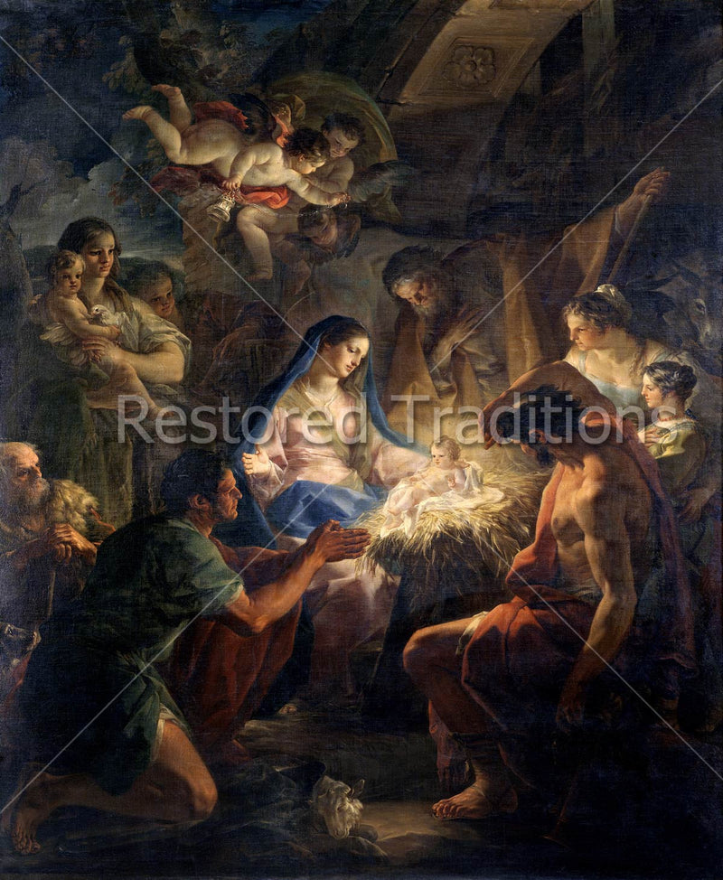 Light shines from the Infant Jesus as He lies in His straw-filled manger, casting a warm glow on His Mother and the shepherd family gathered about Him. Cherubs look down at the loving scene.
