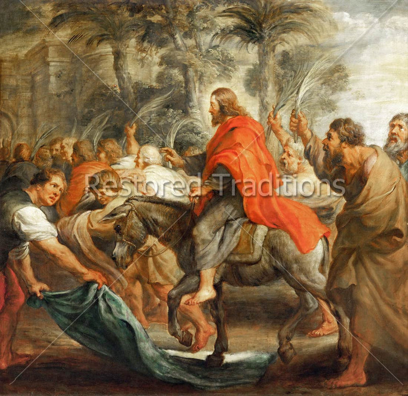 This artwork, by P. Rubens, shows Jesus triumphantly entering Jerusalem on Palm Sunday, while excited bystanders greet Him by waving palms and throwing a cloak on the ground before Him.