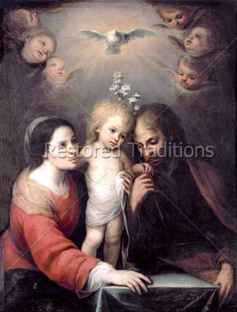 Mary and Joseph hold the Baby Jesus between them as cherubs look down from Heaven and the Holy Ghost, in the form of a dove, descends on the Savior Artwork by J. Gutierrez.