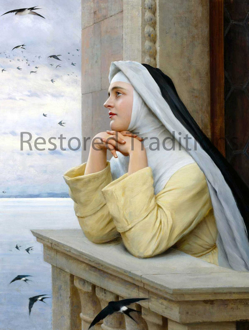 , a nun gazes out from a balcony as small birds fly though the air. The nun doesn't look at the birds but contemplates something beyond them.