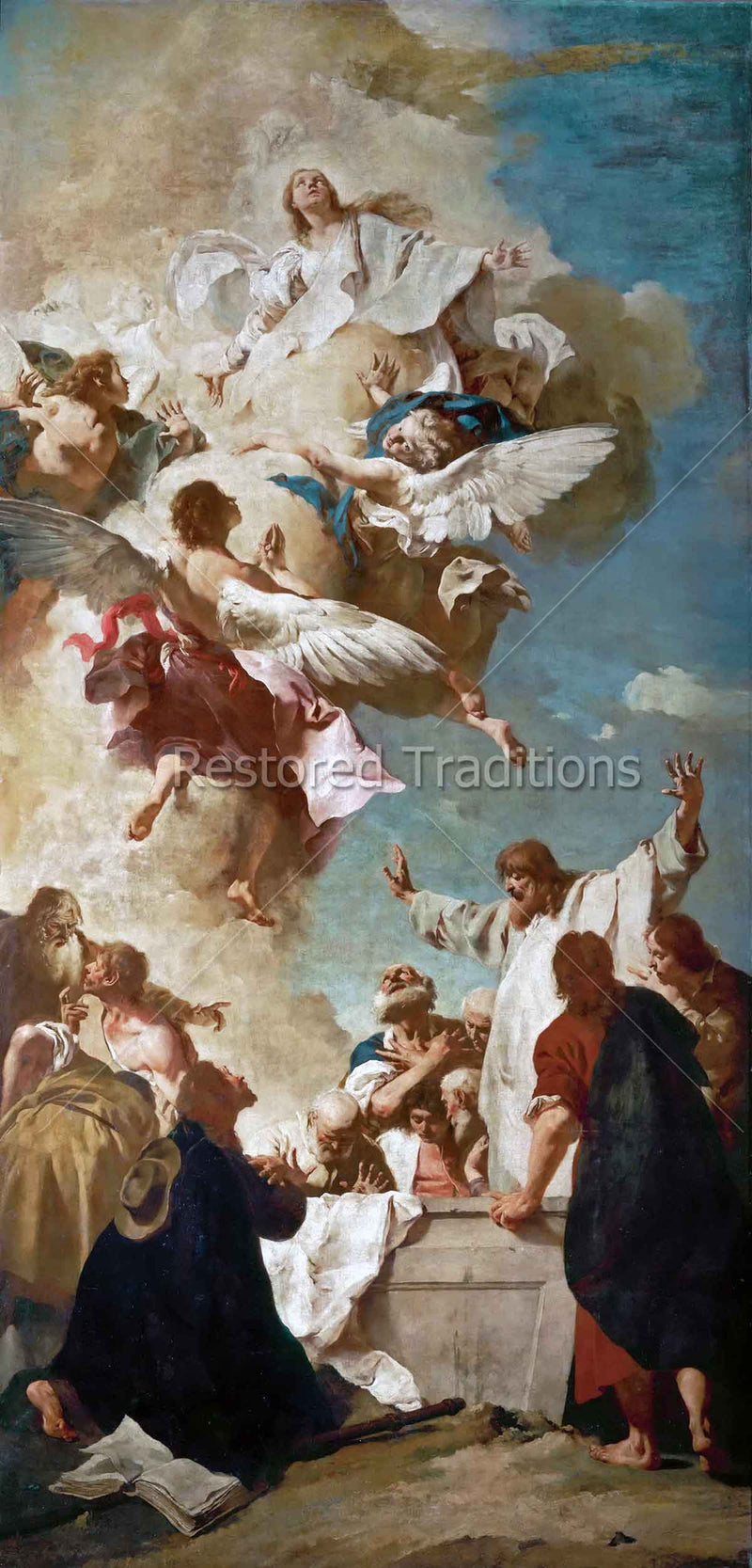 Borne up on a cloud by angels, the Virgin Mary leaves her tomb for Heaven. The apostles, amazed at finding the empty tomb, reverently look towards Heaven.