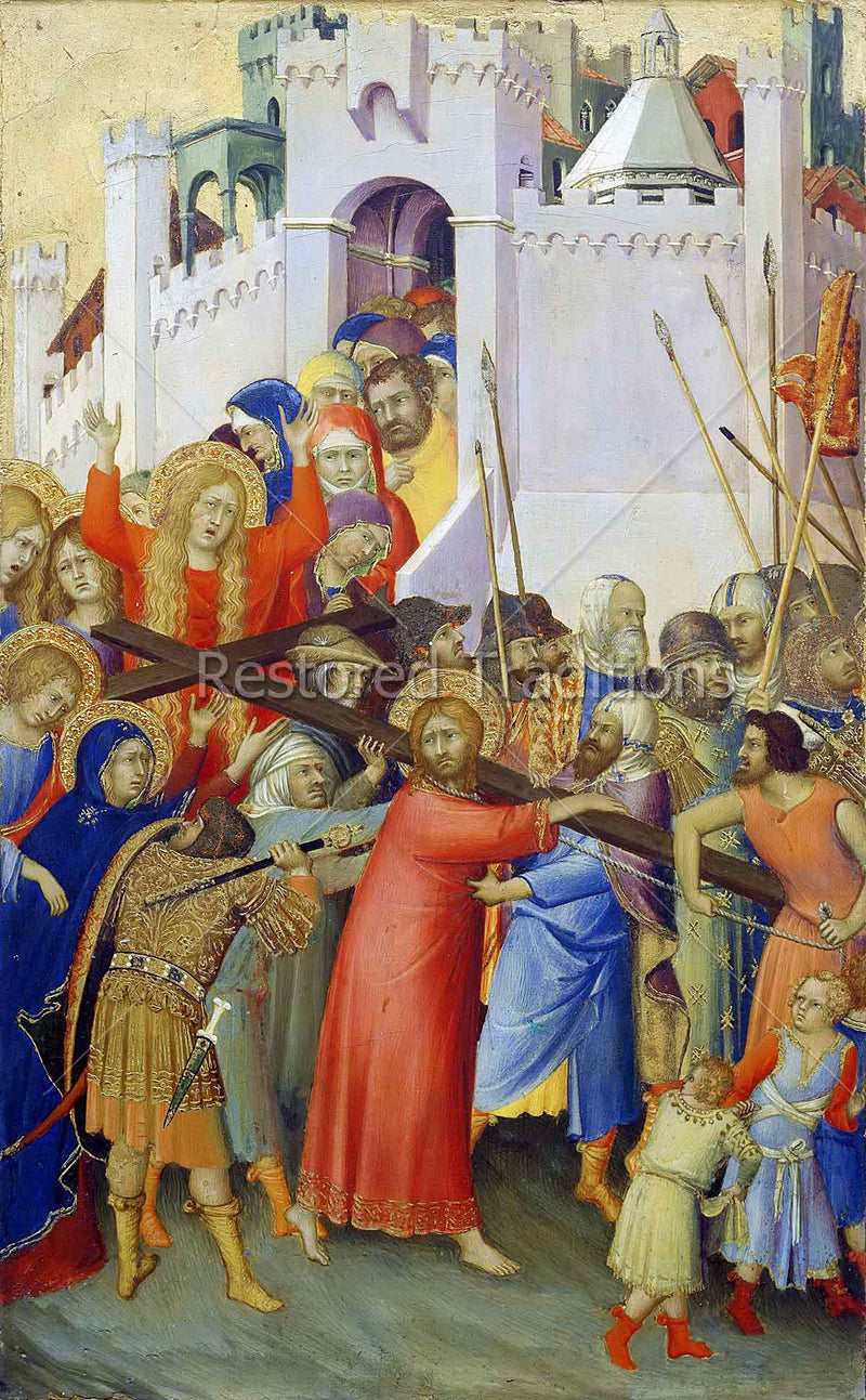Our Lord carries the Cross, with the weight of our sins upon His shoulders, outside the city of Jerusalem to Mount Golgotha.