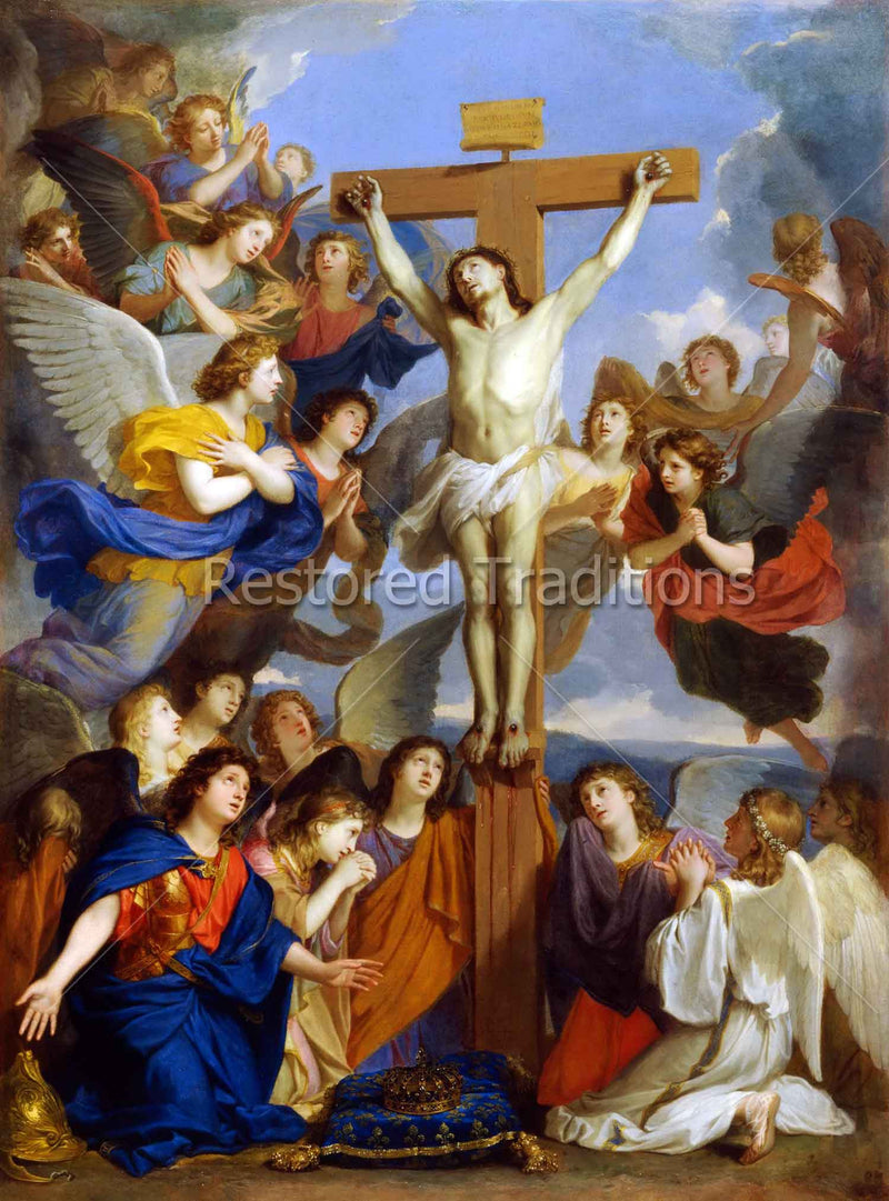 Our Lord hangs on the Cross, surrounded by a crowd of adoring angels. Some of the angels kneel on the ground, while others hover in the air near the Crucifix. The angels have placed a crown on a cushion at the foot of the Cross, symbolizing Christ's conquest over sin. Artwork by