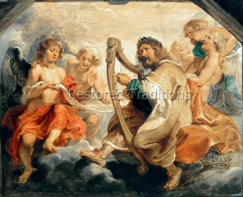 King David, author of the Book of Psalms, plays his harp so beautifully that angels gather round him, in this artwork by P.