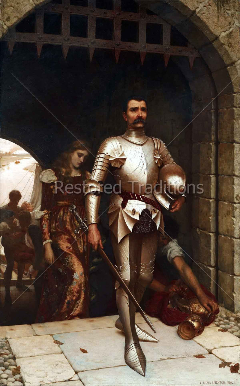 A knight, together with his court, humbly exits his castle after being defeated in battle. Artwork by E.