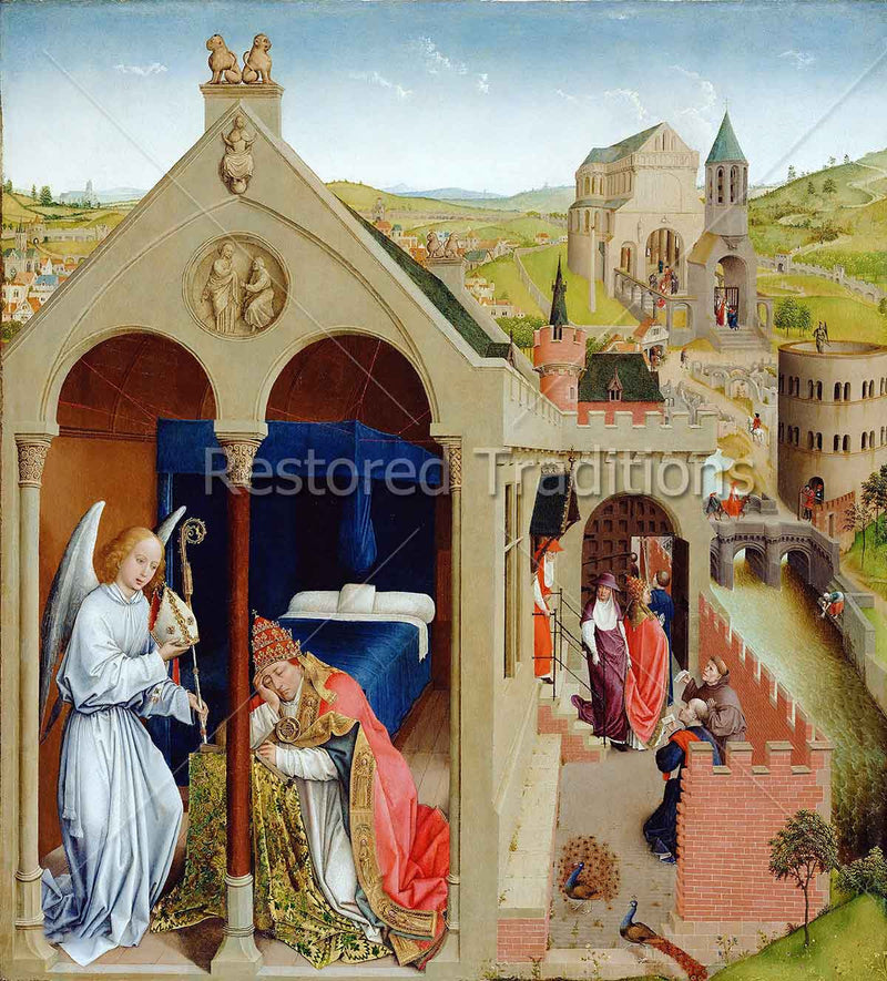 An angel appears to Pope Sergius in his sleep and tells him that Saint Lambert has been killed, and that the Pope must appoint Saint Hubert as bishop. This is a companion artwork to the