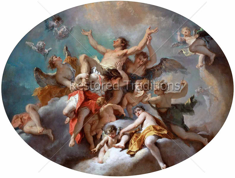 Saint Sebastian, an early Christian martyr of the Church, is raised up to Heaven by choirs of angels, freed from the arrows of his martyrdom. Artwork by S.
