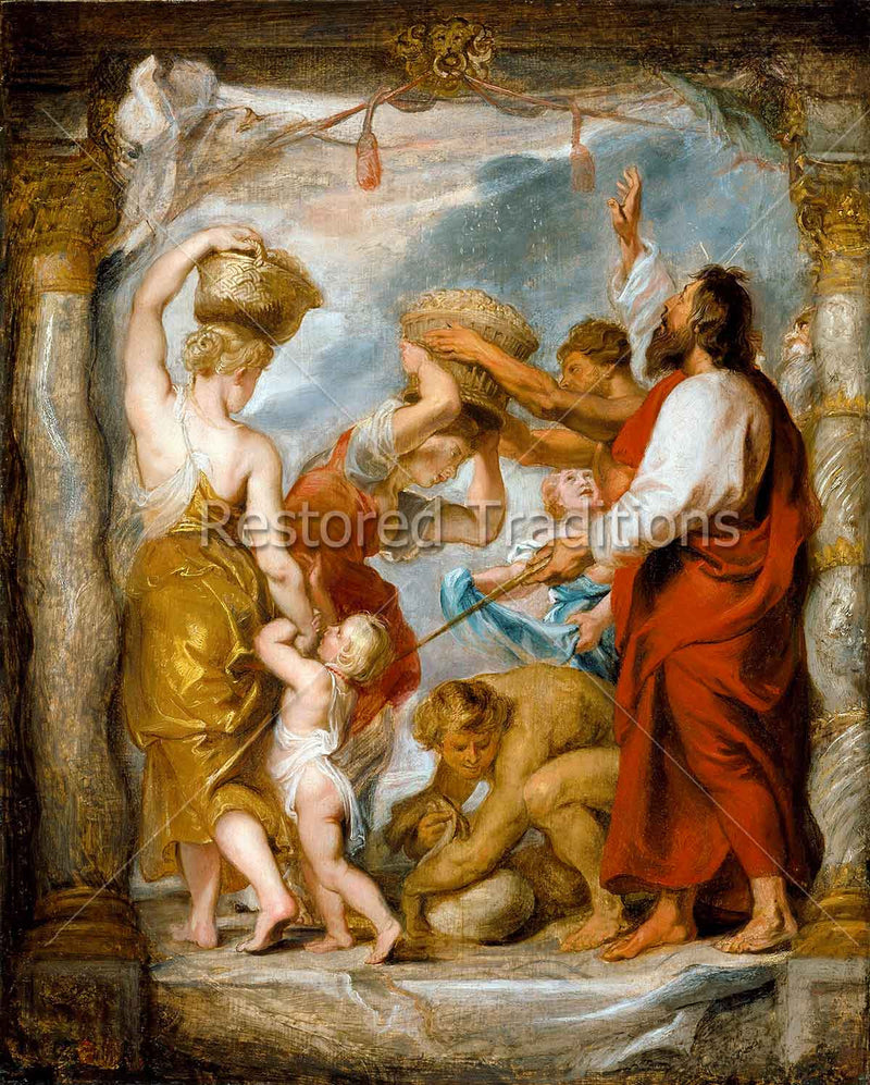 The Israelites, at the prayer of Moses, receive bread from Heaven to sustain them in the desert. They gather manna off the ground, filling baskets. Artwork by P. Rubens.