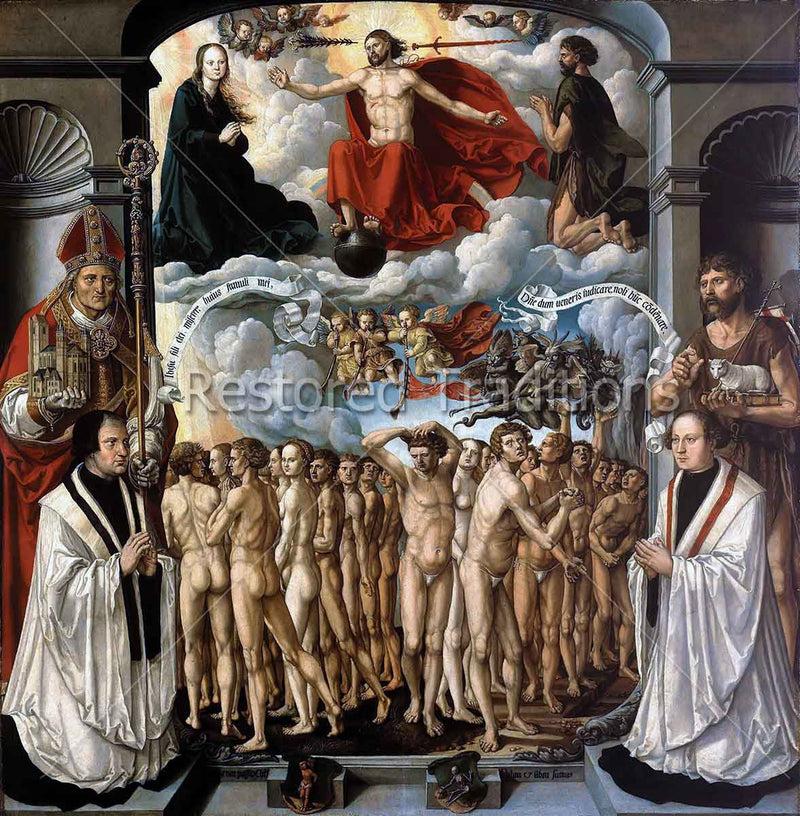 After the Apocalypse, Christ, surrounded by His Mother and John the Baptist and heralded by the trumpets of angels, pronounces final judgement on all souls. This image of the Last Judgment depicts confessors and a bishop on the threshold of eternity, guarding the Church. Artwork by A. Woensam