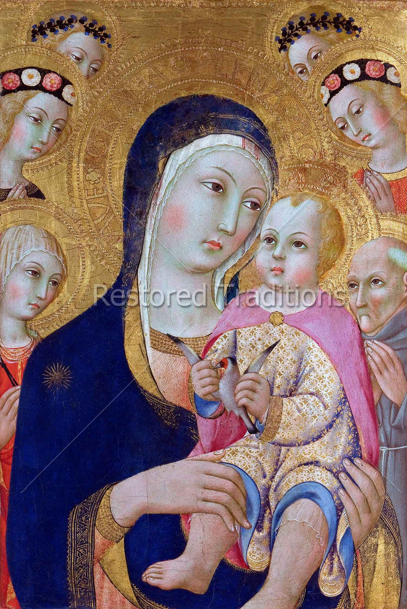Our Lady holds the Christ Child in her arms. Four angels, St. Apollonia, and St. Bernardino lovingly gather around the Mother and Child. Artwork by S. Pietro.