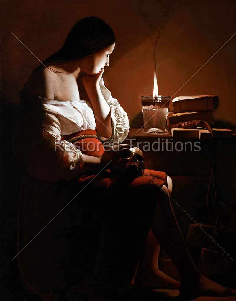 Mary Magdalene sits alone in candlelight, meditating with her hand resting on a skull in her lap. Artwork by G. La Tour