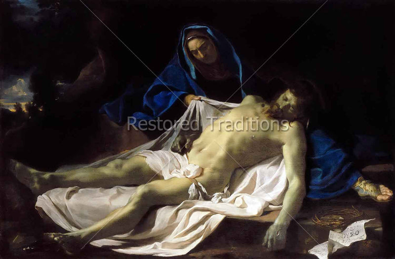 The Blessed Mother sorrowfully lays out the body of her dead Son before burial. Artwork by Le Brun