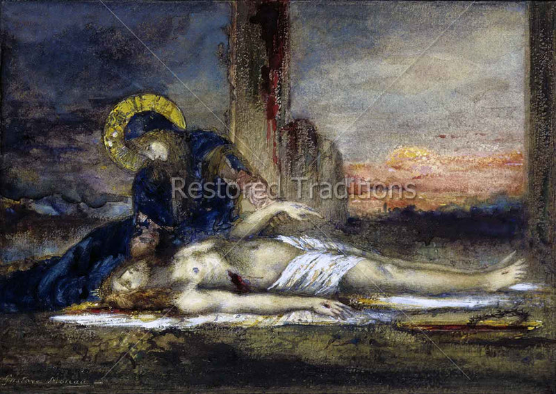 The Sorrowful Mother bends over the body of her dead Son, Christ. Artwork by G. Moreau.