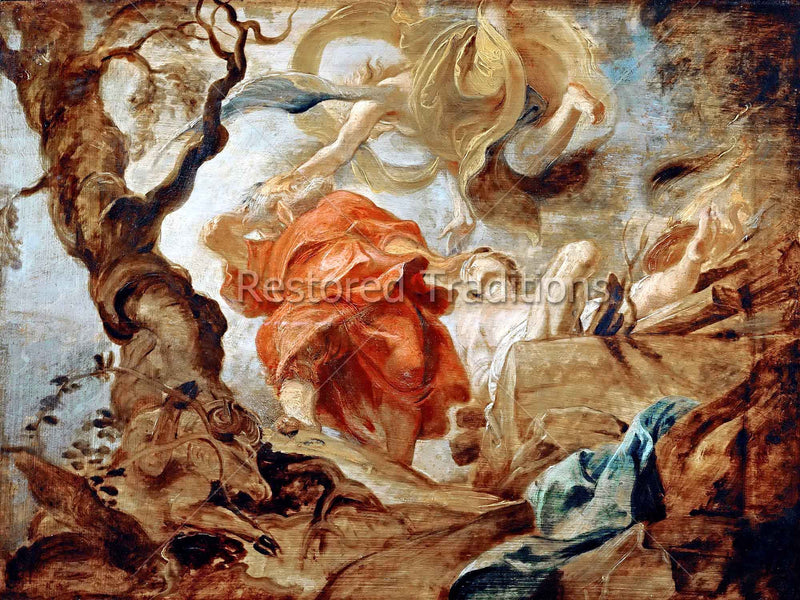 As Abraham is about to sacrifice his son Isaac to God, an angel appears, preventing the patriarch from making the sacrifice. Artwork by Peter Paul Rubens