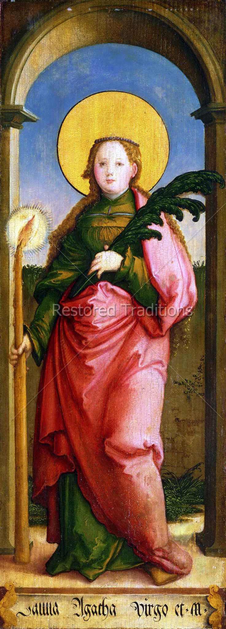 St. Agatha was an early Christian virgin and martyr from Sicily, Italy. She is invoked against the eruption of the volcano Mount Etna. Artwork by the Master of Messkirch.