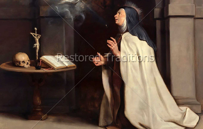 , St. Clare prays before a crucifix and a skull, calling to mind God's mercy and her nothingness as a creature.
