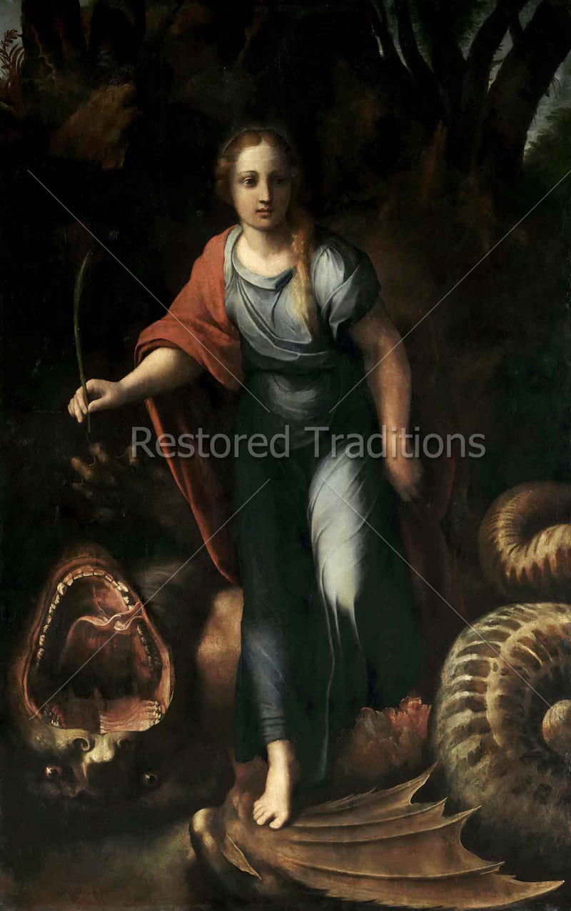 St. Margaret, the Virgin of Antioch, is the patroness of childbirth because, as depicted in this image, the devil, in the form of a dragon, swallowed her up. The cross in the holy virgin's hand irritated the dragon so much that he was forced to spit her back out. Artwork by Raphael