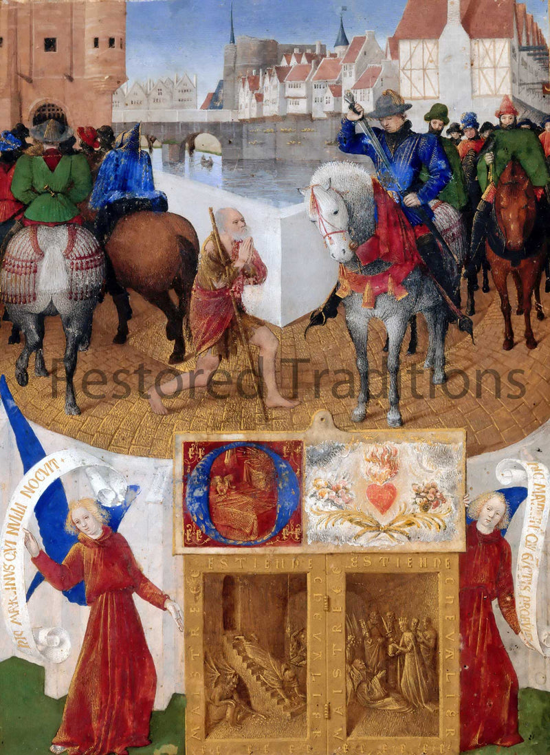 depicts the story of the saintly Roman soldier, Martin, who cut his cloak in two so that he could share it with a beggar man.