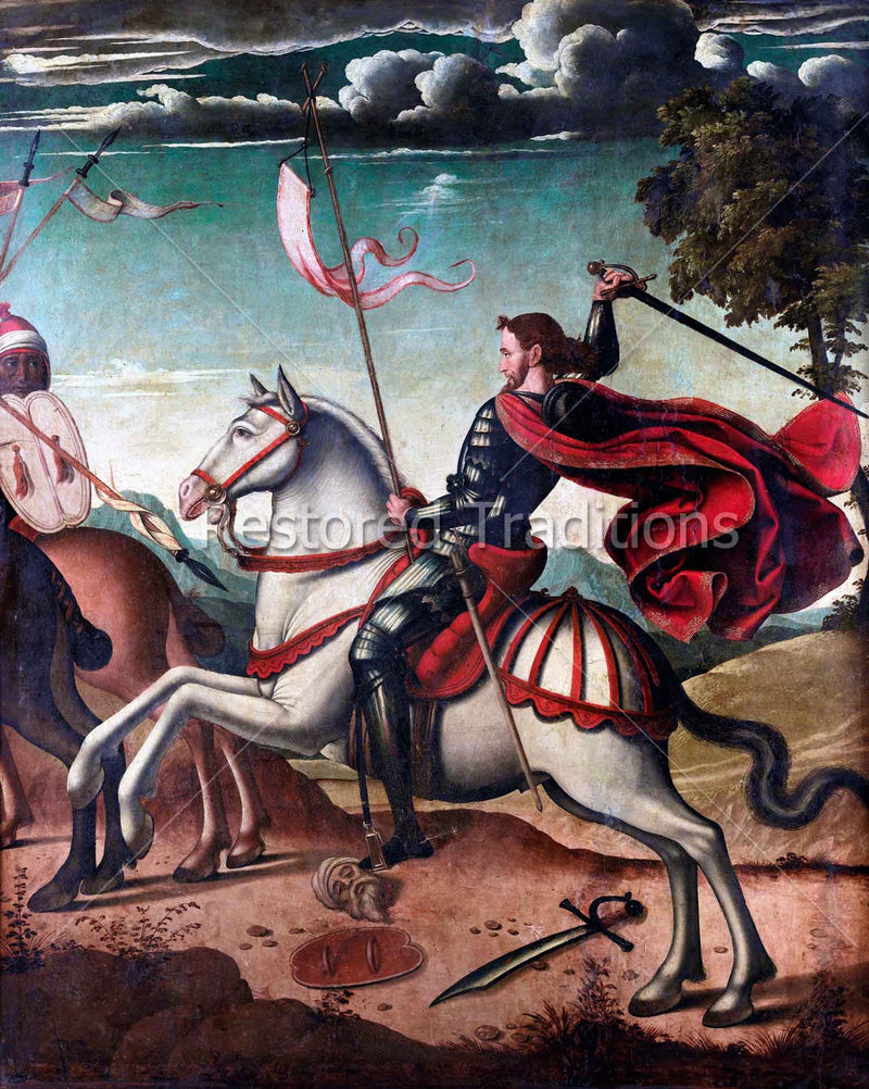 Saint James the Apostle appears in the Battle of Clavijo to lead the Christian army in victory against the Moors. The Apostle James is known as the Patron Saint of Spain and is called Santiago Matamoros, James the Moor-Killer. This artwork was originally produced at the School of Valencia in the sixteenth century.