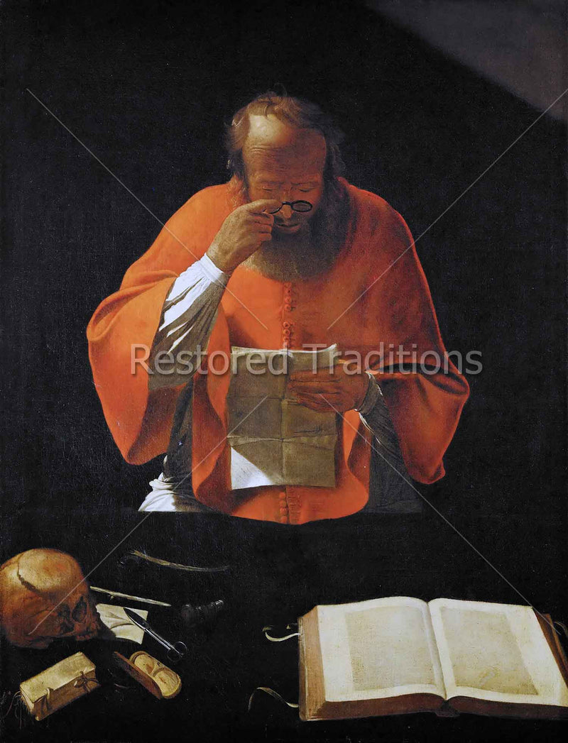 Saint Jerome, a fourth-century monk and learned Western Doctor of the Church, is the Patron Saint of Librarians. Artwork by G. La Tour.