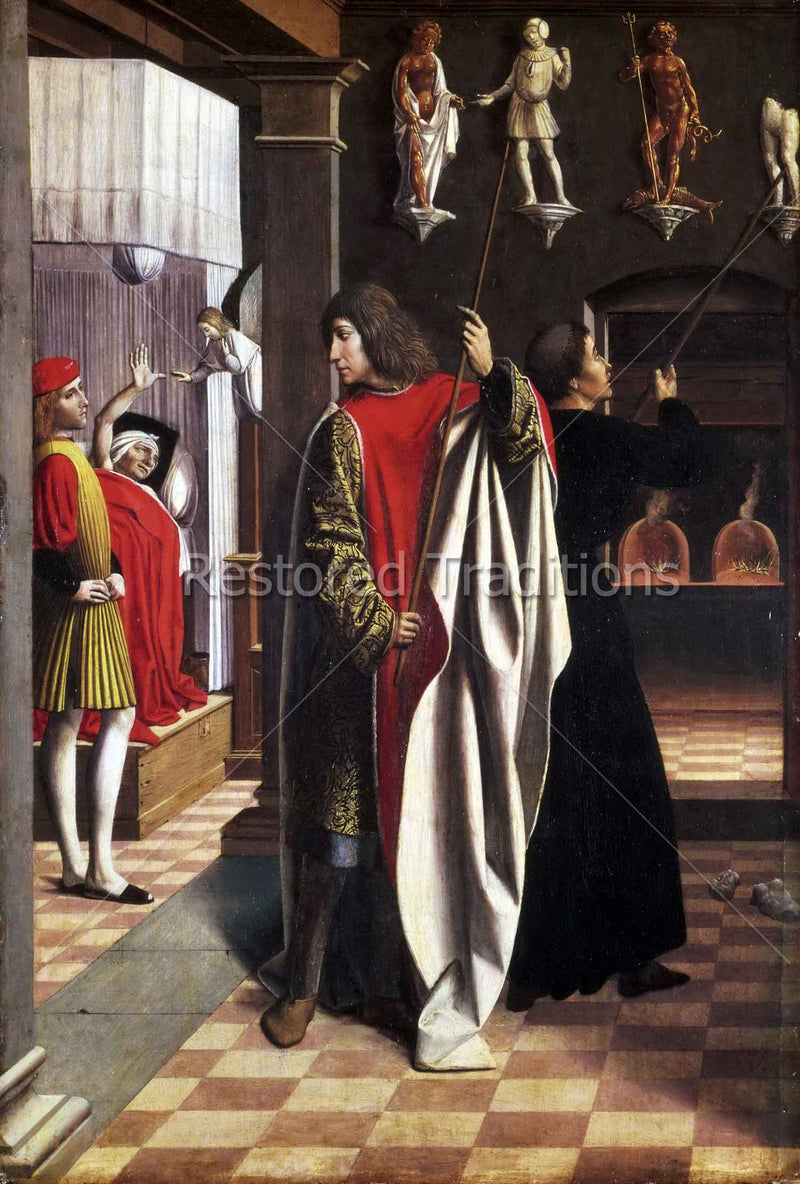 Saint Sebastian, an early Christian martyr of the Church, is shown here tearing down idols in the pagan temple. Artwork by Lieferinxe.