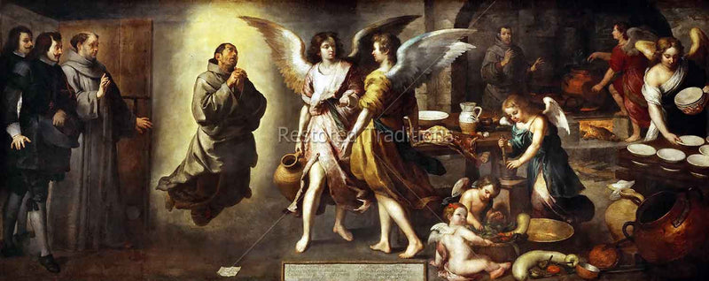 The brother superior, accompanied by other monks, enters the kitchen to find Saint Joseph of Cupertino floating in the air in ecstasy and praying. Angels busy themselves with the Saint's kitchen duties. St. Joseph of Cupertino is the Patron Saint of Pilots. Artwork by Murillo