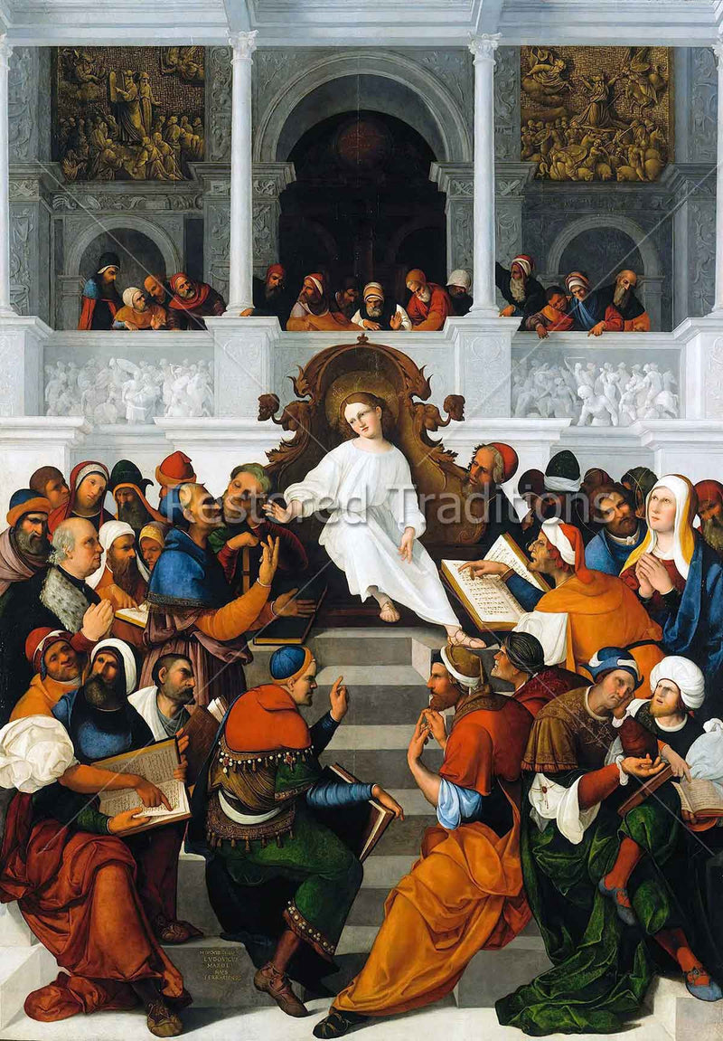 Our Lady and Saint Joseph find Our Lord, a young boy, teaching the Word of God while sitting on a throne above the doctors of the law in the Temple. Artwork by L. Mazzolino.