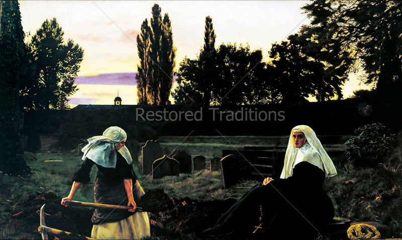 Two nuns dig a grave in the cemetery for a deceased fellow sister while praying the rosary. Artwork by J. Millais.