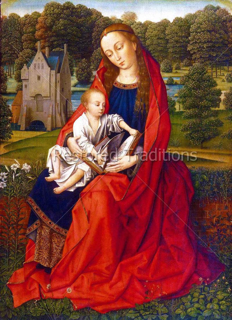 Our Lady, wearing a bright red cloak and a blue dress, sits on a moss-covered red brick wall, holding the Child Jesus in her lap. Christ flips through the pages of a book which Mary holds. In the background, there is a green landscape with trees, a mansion, and a bright blue lake. Artwork by the Master of the Embroidered Foliage
