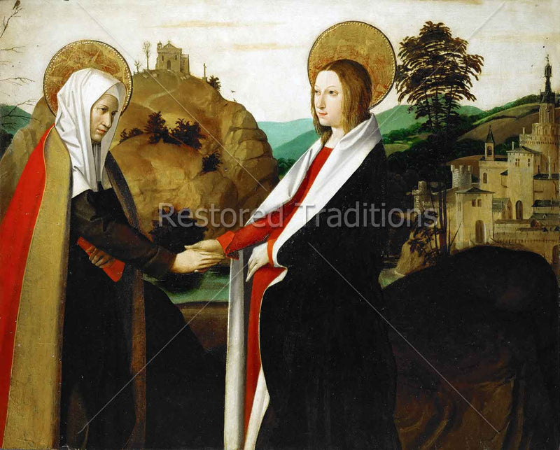 The Blessed Virgin Mary greets St. Elizabeth, after making a difficult journey to help her pregnant cousin, despite being pregnant herself with the Savior. Artwork by the Master of Saint Sebastian.