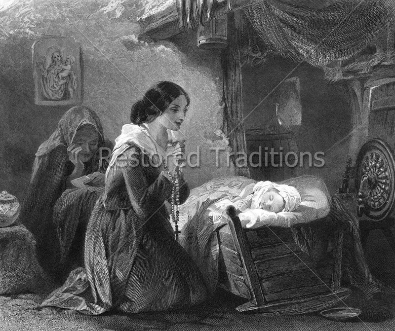 In this antique black and white illustration, a young mother kneels beside her sleeping child's crib while praying the rosary. An old woman sits hunched over a book in the background. Behind the old woman, on the wall, hangs a picture of the Blessed Virgin with the Child Jesus. The beautiful illustration and symbolism express the eternal connection between parent and child, and provide a comforting reminder of God's love.
