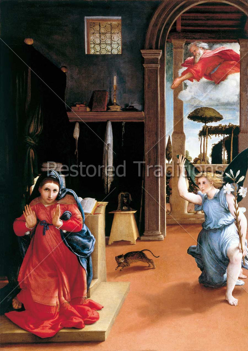 Mary kneels with uplifted hands as the Angel Gabriel, bearing a stalk of lilies, approaches her from an open doorway and God the Father looks down from the sky beyond the doorway. The Blessed Virgin's frightened cat, which scurries from the Angel, contributes to the startled feeling of awe depicted by the painting. Artwork by