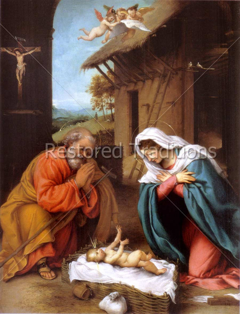 In this artwork depicting the First Christmas, by Lotto, the Virgin Mary and Saint Joseph kneel over the Infant Jesus lying in His manger. Cherubs flying in the air above sing together, holding a sheet of music between them. A crucifix hangs in the background.